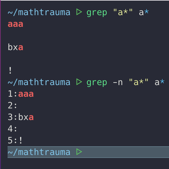grep 명령어에 매치된 행의 번호를 출력하는 -n 옵션을 사용해서 공백문자열(a 가 0개) 도 매치되었음을 확인했습니다.